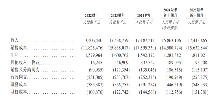 招股书显示,国恩股份2022年、2023年、2024年营收分别为134亿元、174.4亿、191.9亿元;期内利润分别为7.2亿、5.4亿、7.2亿元,复合年增长率(CAGR)为19.6%。2025年前10个月营收为174.4亿元,毛利为18.1亿元,利润为7.21亿元。